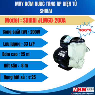 Bơm tăng áp điện tử SHIRAI 200W 33L/P JLM 60-200A được thiết kế với kiểu dáng nhỏ gọn, tiếp dẫn dịch thể tốt, đẩy rất cao, gọn nhẹ và không gây tiếng ồn. Rúp bê được lắp trong máy, tự động dẫn hút nước giếng với lực hút rất mạnh, so với các loại máy bơm răng cưa thông thường thì khả năng hút càng sâu với lượng nước lớn